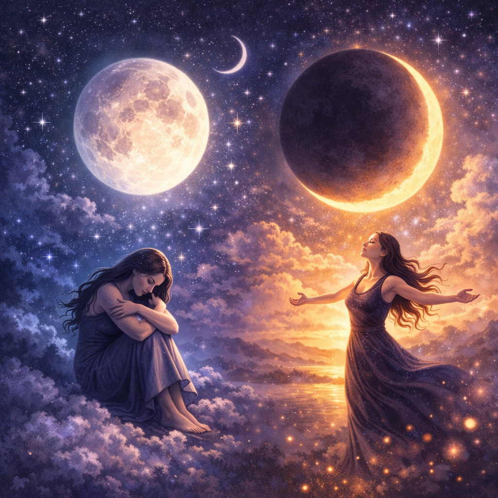 Luna působí jako zrcadlo duše. Úplněk má tendenci vytahovat emoce na povrch, zesilovat pocity a upozorňovat na to, co bylo dlouho potlačené. Může přinést neklid, ale také uvolnění a pochopení. Novoluní naopak otevírá prostor pro nové začátky, záměry a tiché vnitřní rozhodnutí.