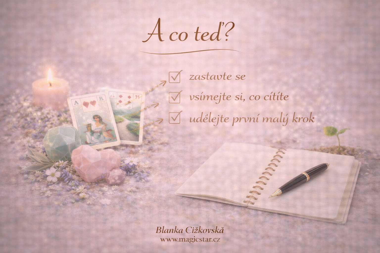 Velmi důležité jsou malé kroky. Není nutné měnit všechno najednou. Stačí jeden drobný krok nebo změna, která z výkladu vyplynula. Sledujte, jak se při tom cítíte, a podle toho se rozhodujte dál. Právě tak se změny stávají přirozené a udržitelné.