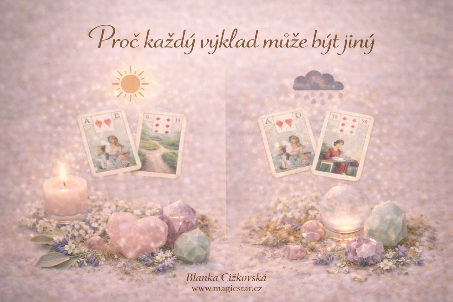 Každý výklad karet je jedinečný a nikdy se neopakuje úplně stejně. Je to proto, že odráží energii konkrétního okamžiku, Váš vnitřní stav a kontext situace, ve které se právě nacházíte. Karty nereagují mechanicky, ale citlivě a živě.