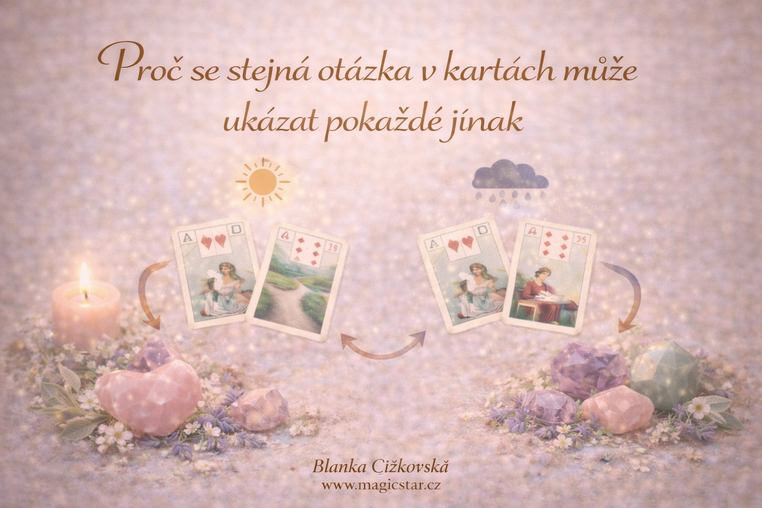 Někdy se lidé ptají na stejnou věc opakovaně a překvapí je, že karty odpovídají pokaždé trochu jinak. Může to vyvolat pochybnosti nebo otázky, zda je výklad vůbec spolehlivý. Ve skutečnosti je tento rozdíl přirozený a dává hluboký smysl.